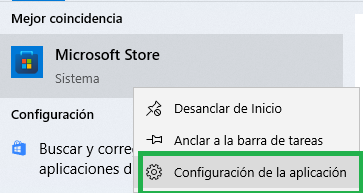 - Si no encuentras la tienda en la lista, utiliza el buscador en la barra de tareas. Escribe 'Microsoft Store' y, en la sugerencia ofrecida, haz clic derecho sobre la aplicación y selecciona "Configuración avanzada".