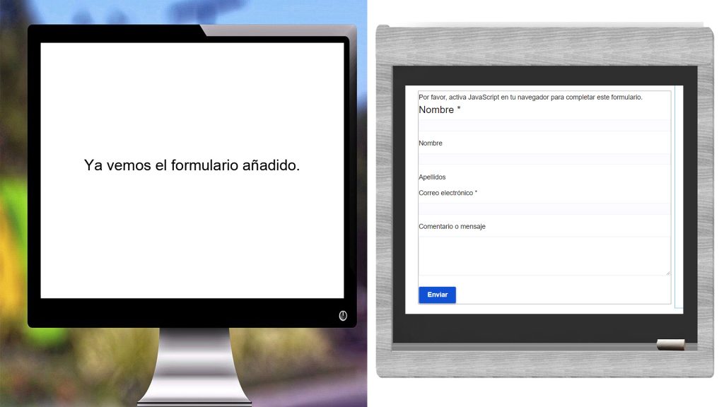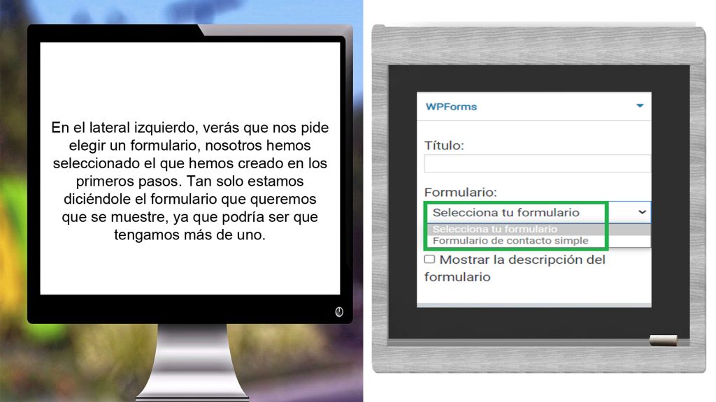 En el lateral izquierdo, verás que nos pide elegir un formulario, nosotros hemos seleccionado el que hemos creado en los primeros pasos. Tan solo estamos diciéndole el formulario que queremos que se muestre, ya que podría ser que tengamos más de uno.