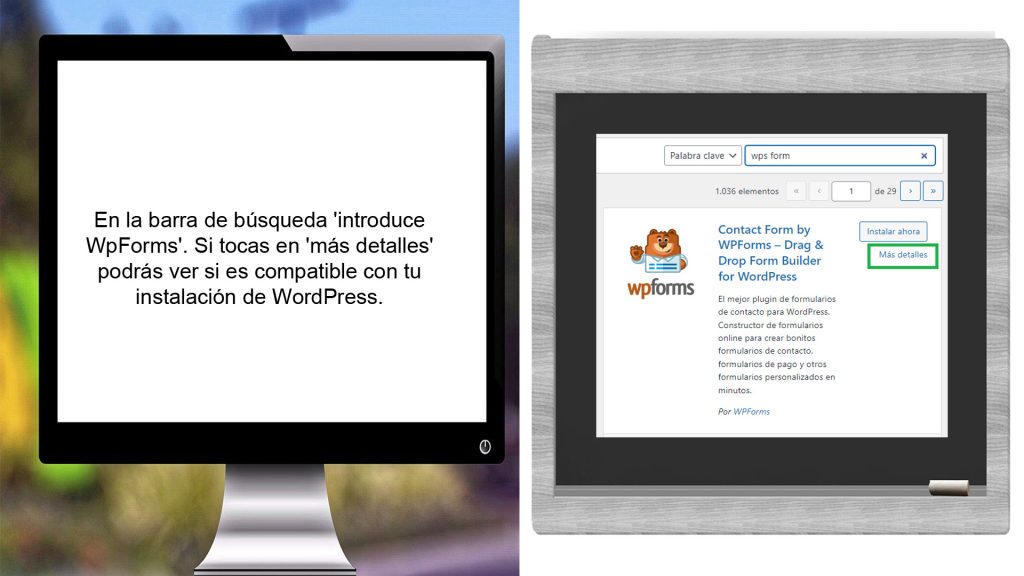 En la barra de búsqueda 'introduce WpForms'. Si tocas en 'más detalles' podrás ver si es compatible con tu instalación de WordPress.
