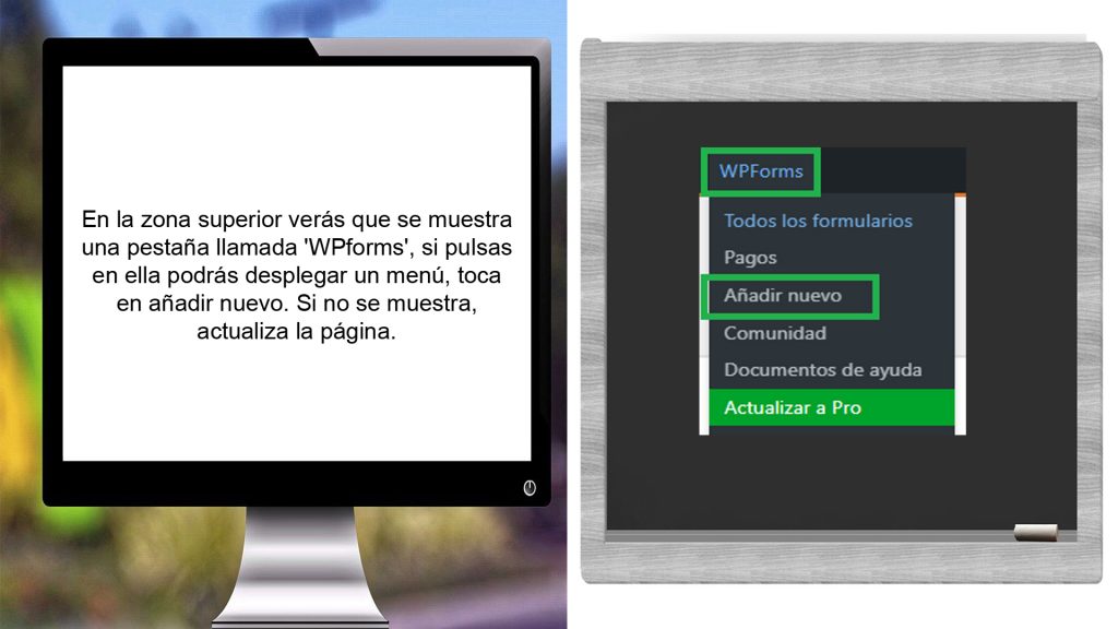 En la zona superior verás que se muestra una pestaña llamada 'WPforms', si pulsas en ella podrás abrir un menú, toca en nuevo. Si no se muestra, actualiza la página.