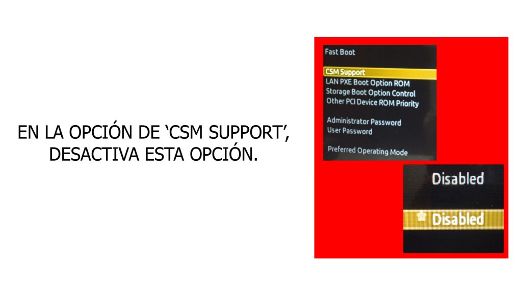 - Desactiva la opción que indica 'CSM Support'. Si pulsas doble clic con el ratón podrás desactivarla.