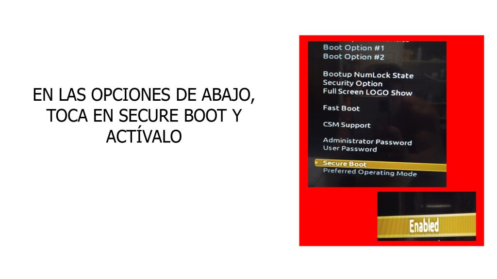 - Tres opciones más abajo podrás habilitar la opción llamada 'SECURE BOOT'.
