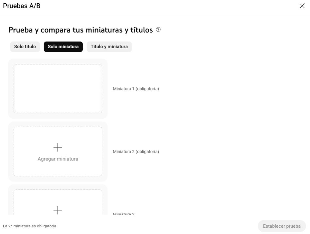 Las pruebas A/B consisten en mostrar diferentes versiones de un mismo elemento (por ejemplo, título o miniatura) a distintas audiencias. En el caso de YouTube, ahora podrás: