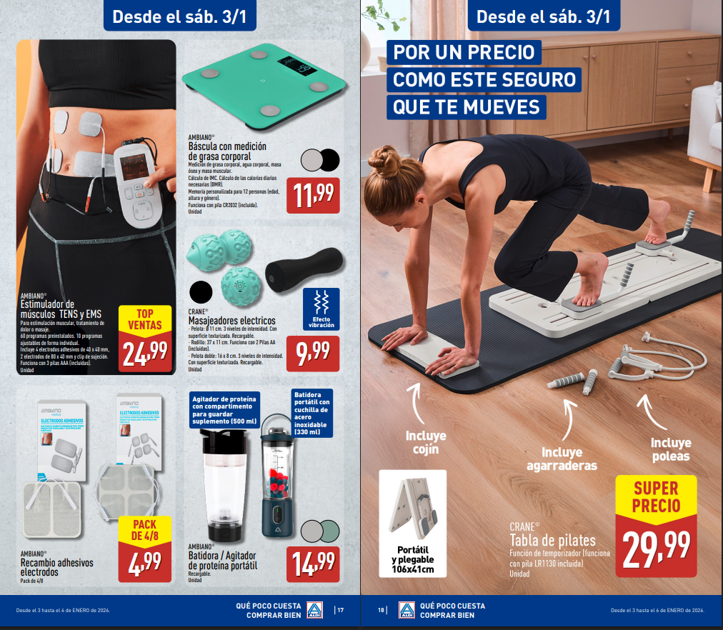 Especial mención merece el especial fitness de enero, con productos de la marca Crane: esterillas, mancuernas, kettlebells, tablas de pilates, bandas elásticas, masajeadores y ropa deportiva, ideales para quienes quieren empezar el año cuidando su salud.
