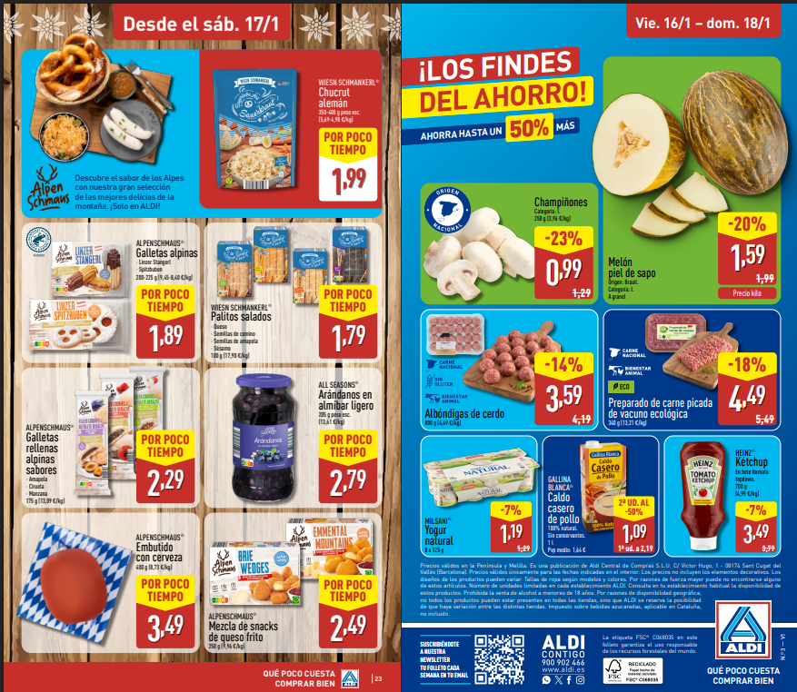 ALDI no vende alimentación online en España, pero puedes consultar el folleto en aldi.es.
